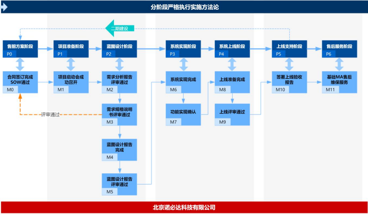 北京诺必达科技有限公司倡导并遵循的项目实施方法,注重管理系统工程的角度,而不单纯以软件应用的角度进行实施。在整个项目实施过程中,北京诺必达科技有限公司将会关注于以下几点: 企业现存的组织架构、业务流程、企业文化等,必然有其合理性,但我们也将基于最佳业务实践的角度,寻求可能的改善之道,以管理和控制角度认识管理信息系统的应用。